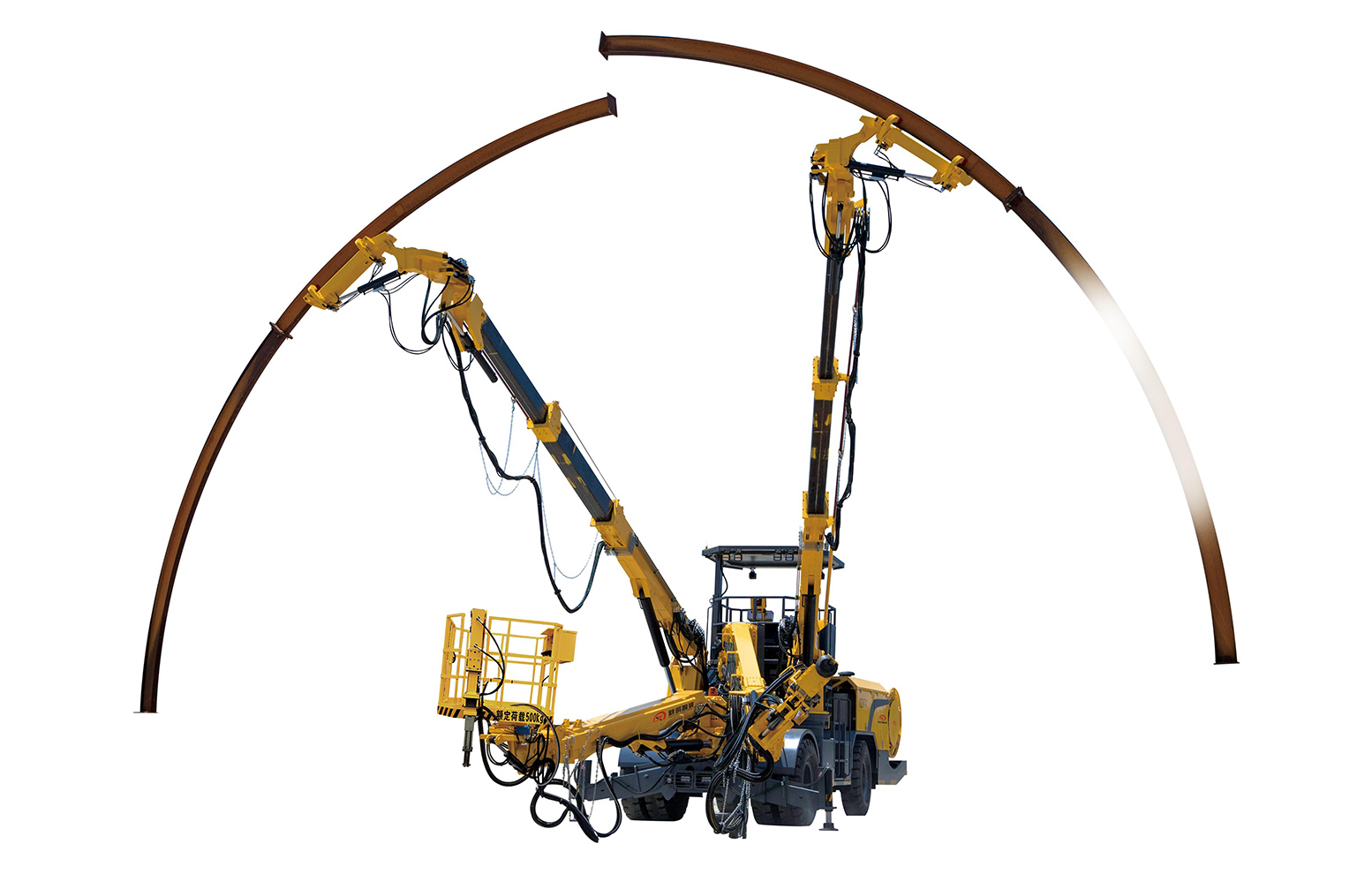 (1)左右拱架安装臂配置大回转机构,自由度高,拱架臂可近地面夹取拱架,拱架空中姿态调整和对接灵活精准;